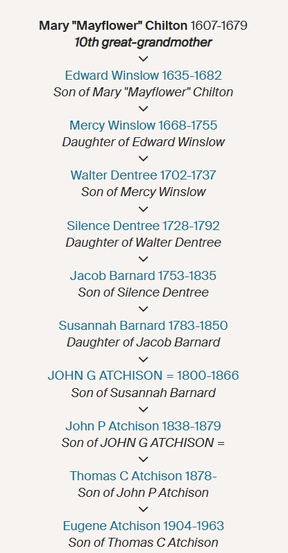 She is either a great grandmother or great aunt we are either from her lineage or her brother-in-law Edward Winslow the Governor of Plymouth’s lineage. They were both on the Mayflower – she married Edward’s brother John who came over later on the Fortune. I think we will end up from Edward Winslow’s lineage, I am still working.